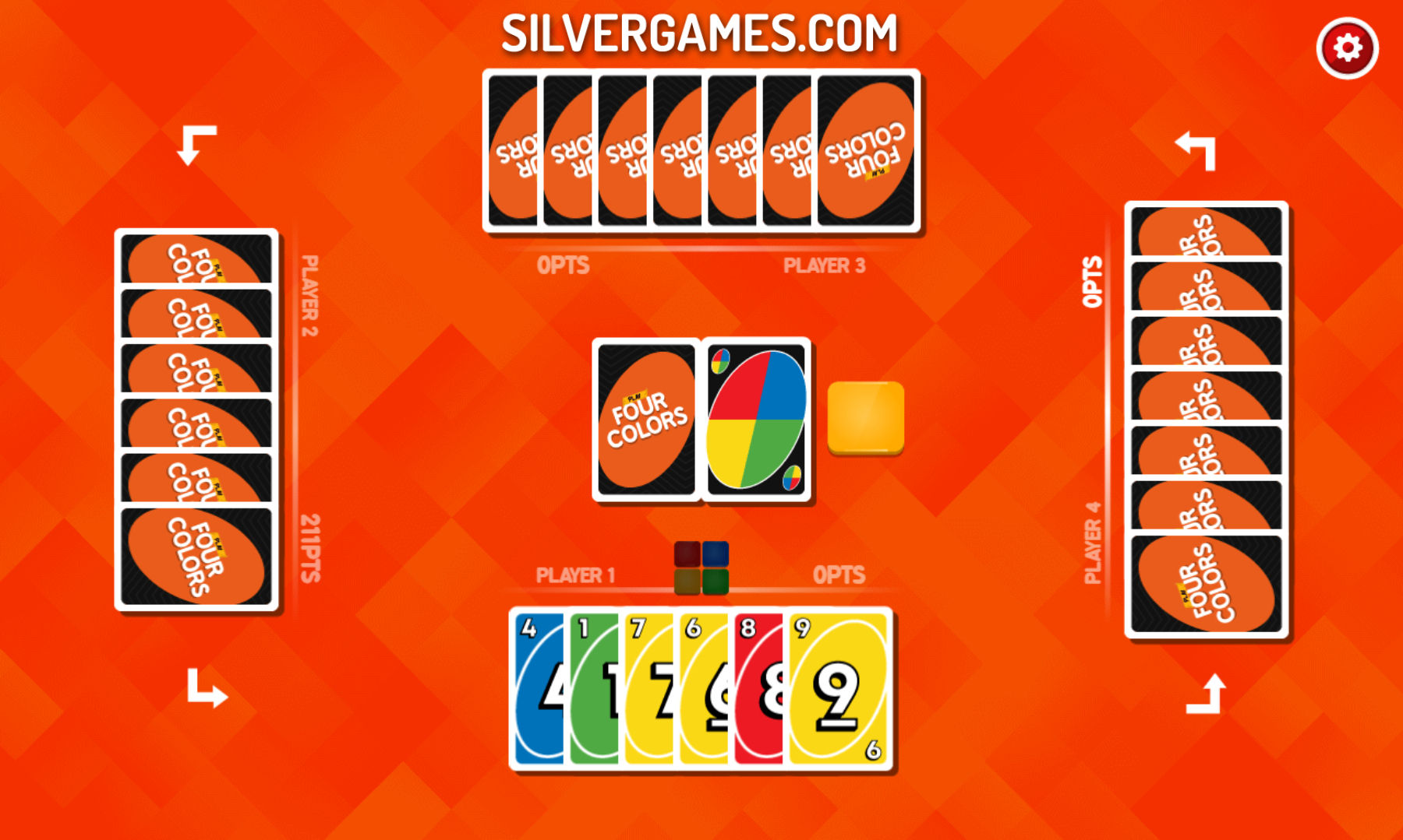 这个名为Four Colors的精彩版本让您可以选择要使用的牌的外观和游戏类型。选择特殊游戏类型,通过一些有趣的牌给比赛增添一点趣味,让您可以破坏对手。在每轮结束时,所有其他玩家手上的分数将是获胜者的分数。玩得开心!