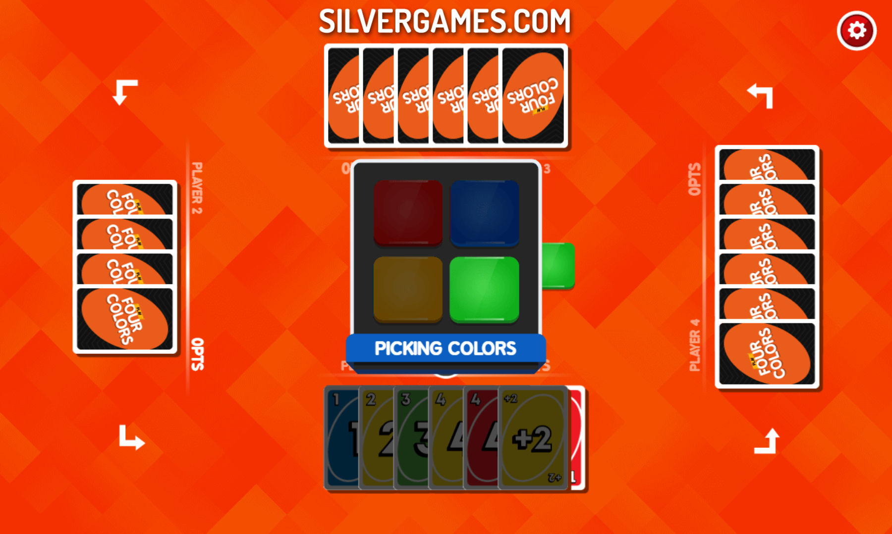 Four Colors是一款有趣的 UNO 纸牌游戏,最快出完手牌的玩家将赢得比赛。在 Silvergames.com 上免费在线玩这个有趣的 UNO 游戏版本。您可以选择 2、3 或 4 名玩家一起玩,这样与 CPU 对抗会更有趣。尝试根据最后一张牌的颜色、数字或符号出掉所有牌,并记住在只剩一张牌时按下 4 种颜色按钮大喊 UNO。