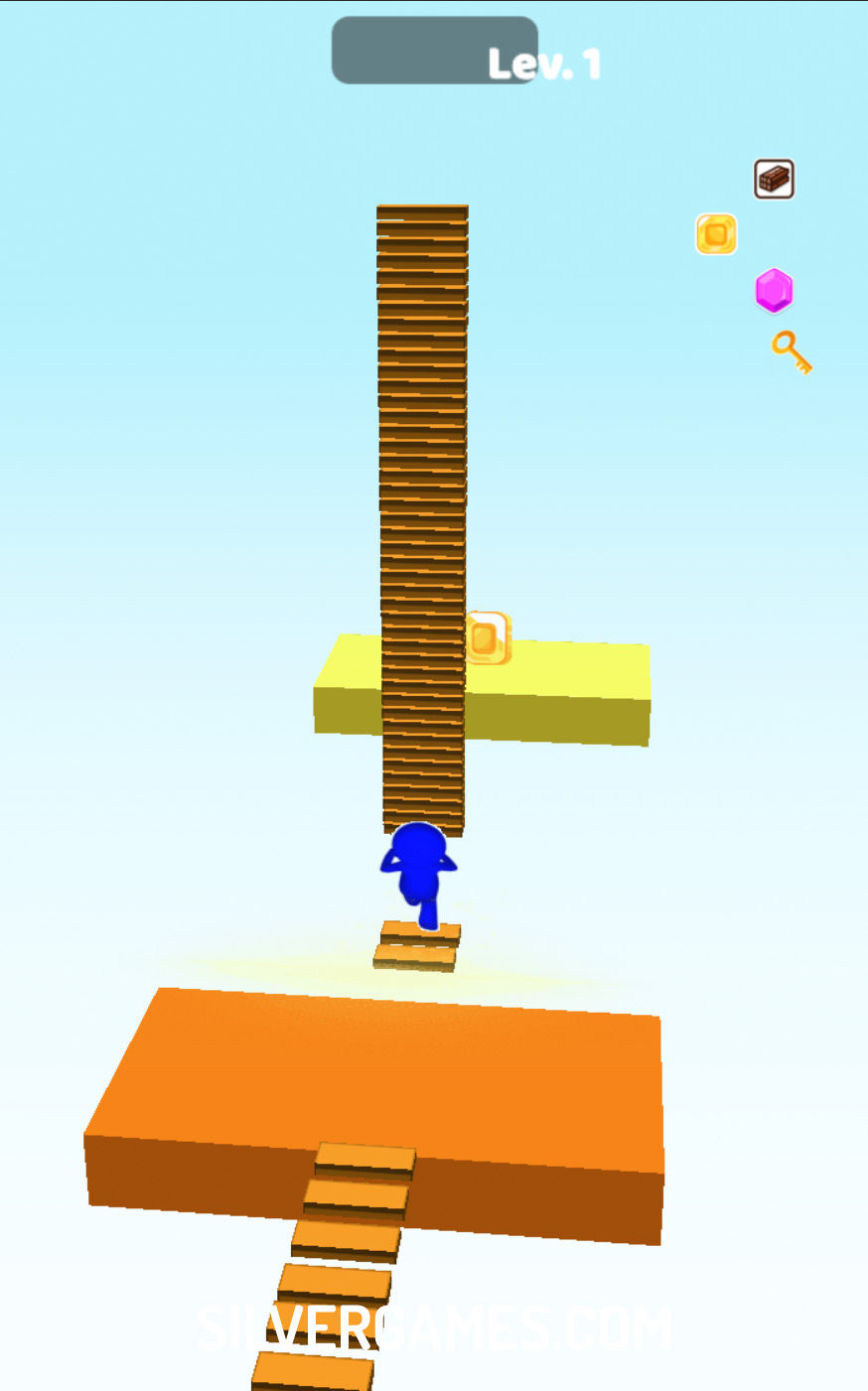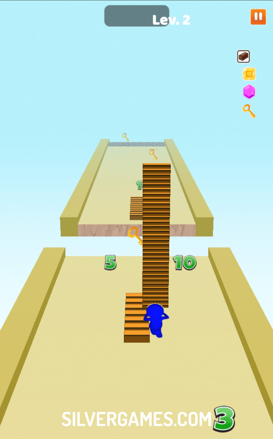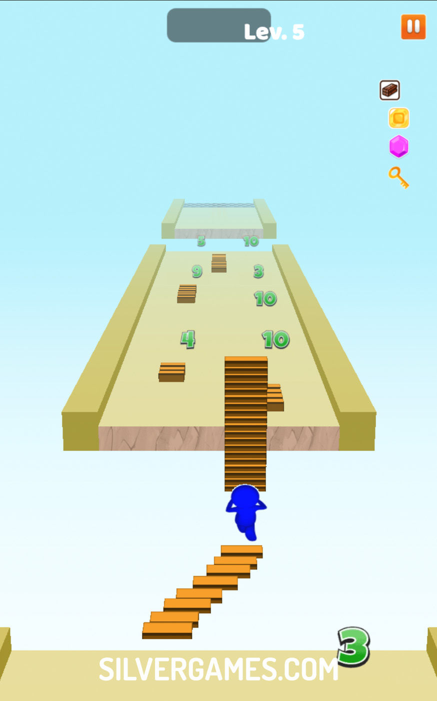 Bridge Run 向玩家发起了一场惊心动魄的冒险,玩家必须收集台阶来搭建桥梁并穿越危险的空隙。玩家可以使用鼠标或手指从左向右移动角色,策略性地收集方块和数字以增加台阶数量。遇到每个空隙时,快速决策是确保收集尽可能多的台阶的关键。