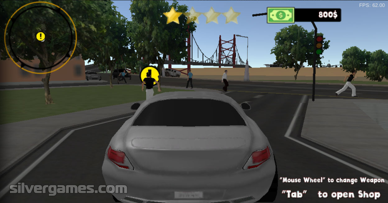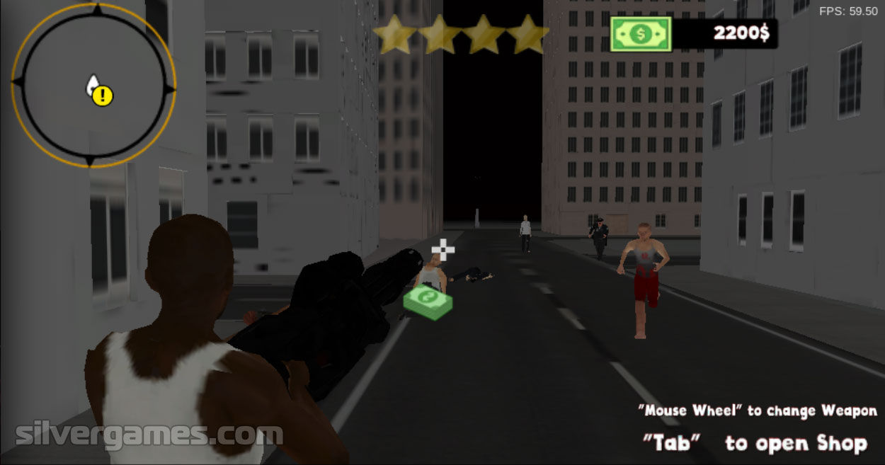 控制:箭头/WASD = 移动,鼠标 = 瞄准/射击/更换武器,Space = 跳跃,Shift = 跑,F = 偷车,TAB = 商店