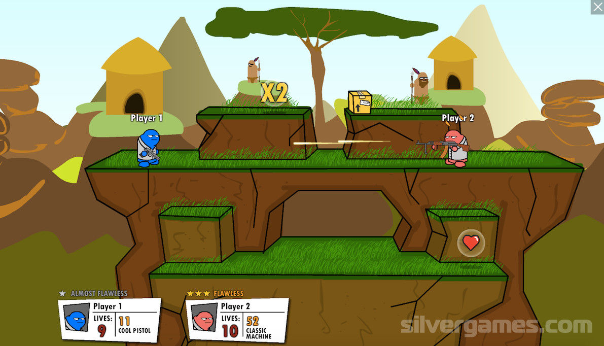 单独或与朋友一起玩,并与疯狂跳跃和射击的对手进行对抗。当他们从平台上掉下来时,您能站稳脚跟吗?失去控制后,您会跳回坚实的地面吗?如果你厌倦了你的旧容貌,你甚至可以改变你的外表,从帽子、上衣和你的肤色。拥有大量具有挑战性的关卡,您将在这款游戏中获得持久的乐趣。在 Gun Mayhem 中,动作快速而激烈,AI 聪明而凶残。快速而聪明地做出反应,以击败每一个阻碍你走向胜利的机器人。