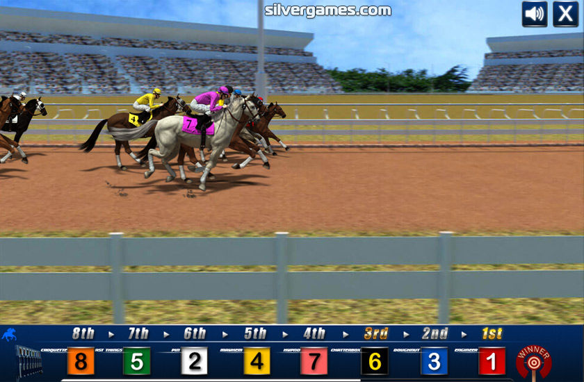 您还可以选择投注获胜(第一名)、名次(第一或第二)或表演(第三或更好),这会增加您的机会。因此,下注并开始致富吧。与经验丰富且富有的赌徒坐在一起,但不要让钱冲昏了你的头脑!在线享受赛马,这是 Silvergames.com 上的免费游戏!