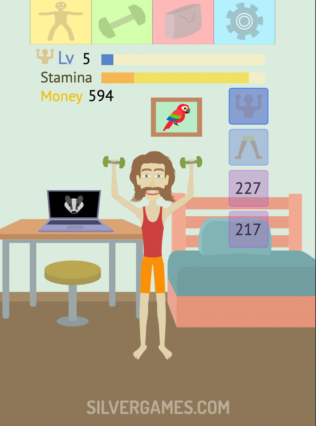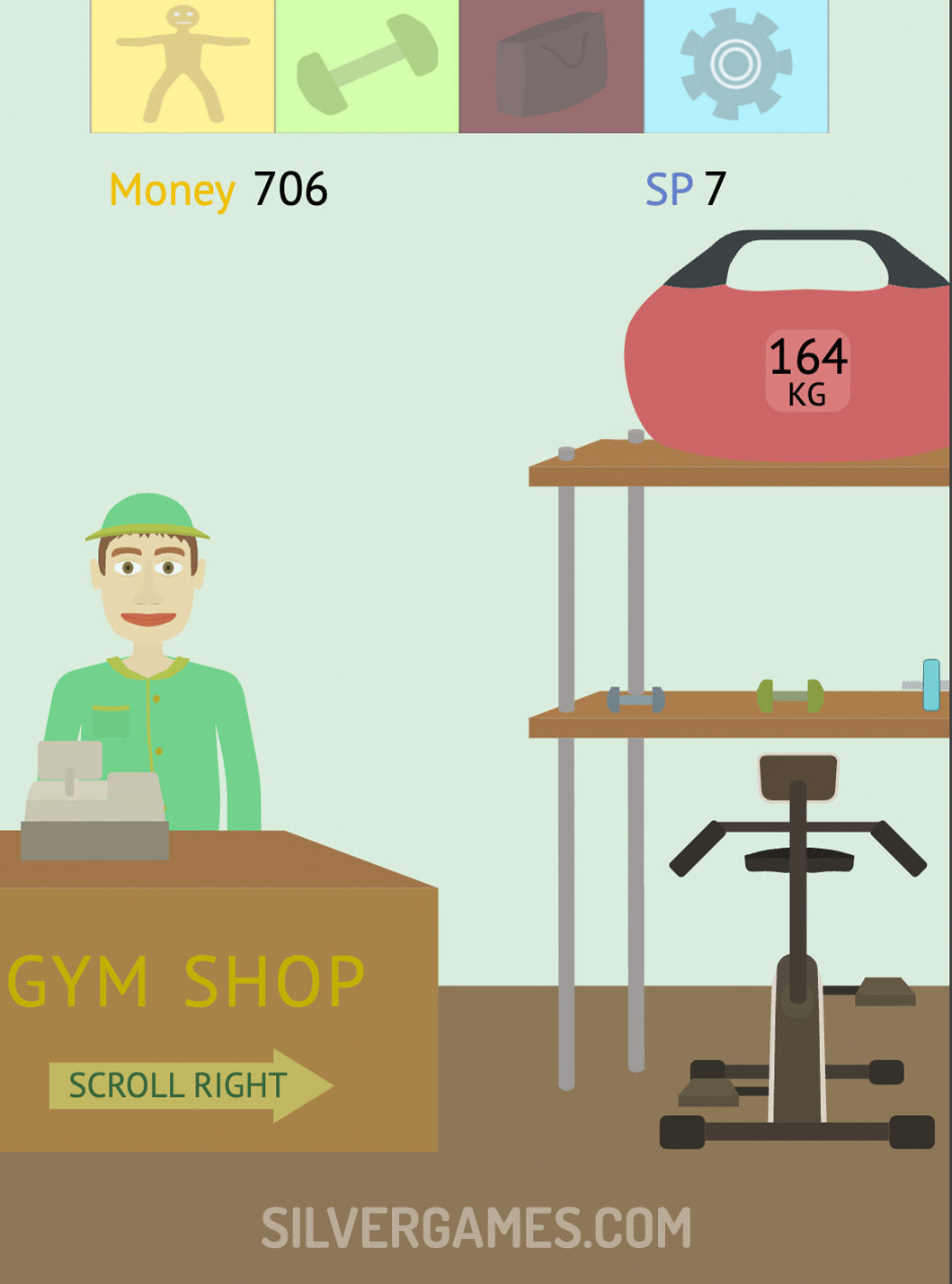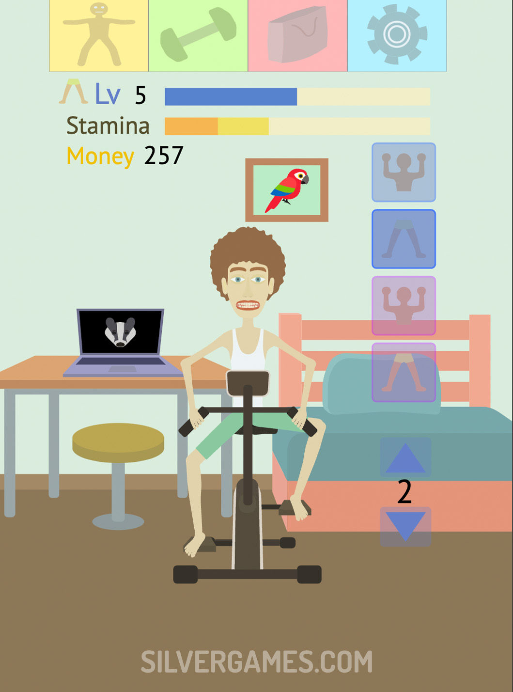 你的旅程开始于你的角色处于不太理想的状态,甚至难以举起最轻的重量或忍受长时间的有氧运动。为了改变你的体质,你必须进行各种锻炼,并按你的方式生长肌肉。每次点击都代表您的努力,随着点击次数的积累,您将见证角色的进步。游戏在你管理角色的耐力时引入了策略元素,确保在锻炼期间不要过度劳累。您将通过辛勤工作赚钱,这些钱可用于购买设备、聘请教练并解锁新的练习,以加速您的肌肉锻炼之旅。