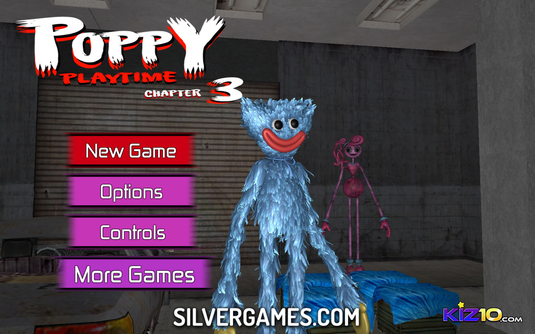 Poppy Playtime 3 是一款令人紧张的第一人称逃脱游戏,您将被困在一所阴森恐怖的房子里,两只怪物在寻找您。在 Silvergames.com 上的这款免费在线游戏中,Huggy Wuggy 和 Mommy Long Leg 正在追捕您。您的目标将是离开这所房子,但首先您必须找到轮胎、汽油和车钥匙,以便驾车逃离。