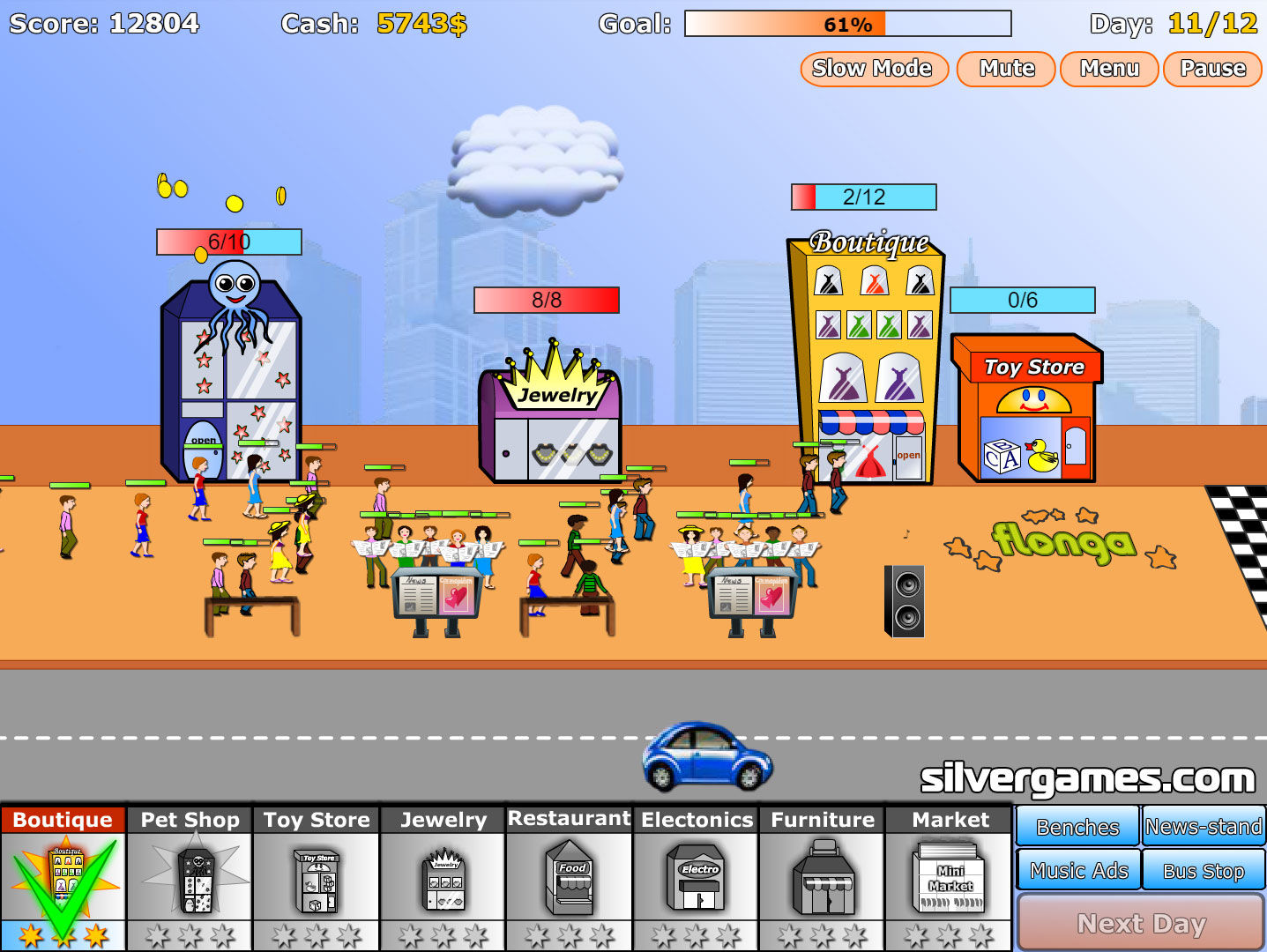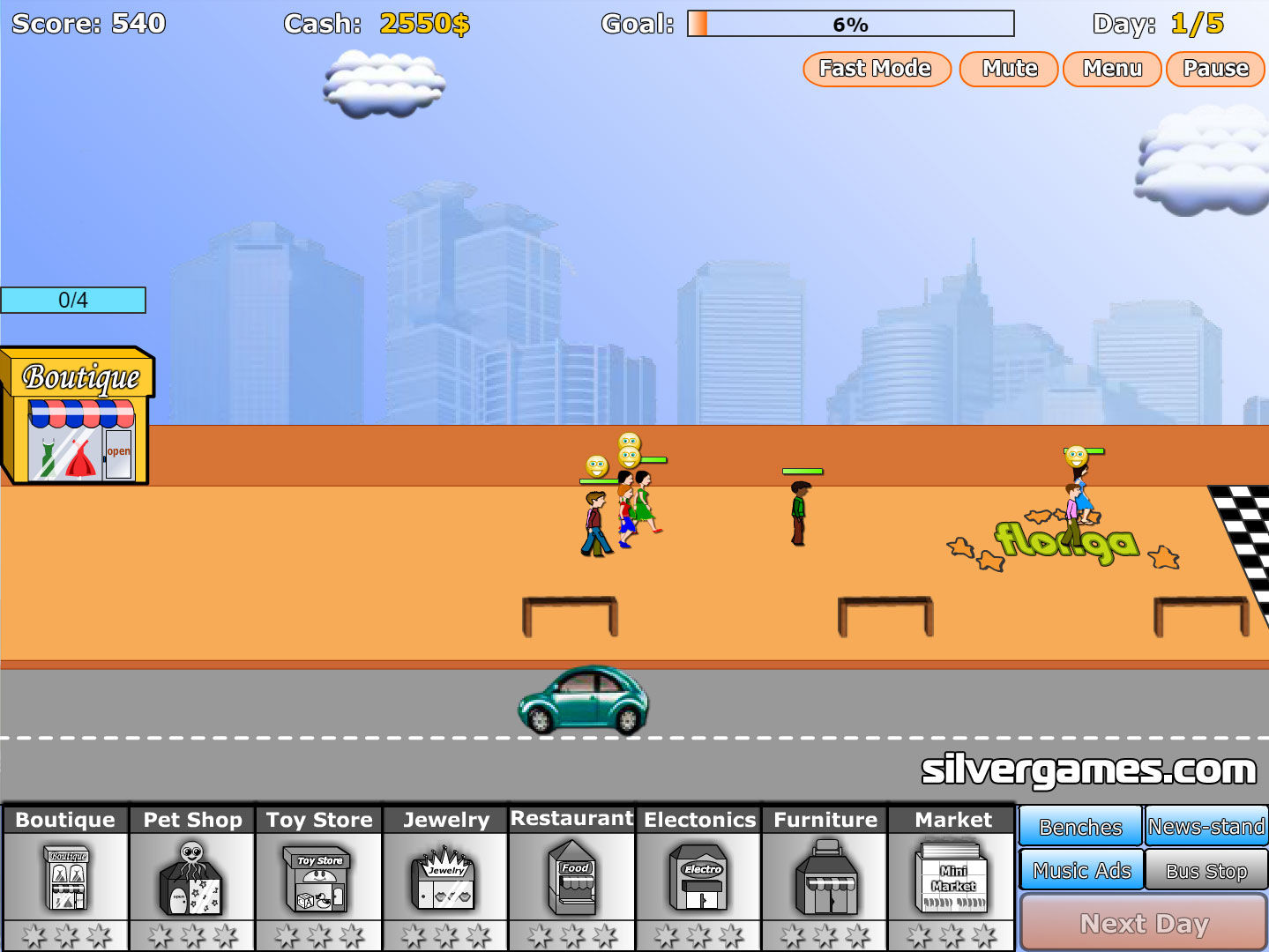 建立您的第一家商店,例如服装店或宠物店,并尝试在有限的时间内赚到足够的钱,这样您就可以购买更多商店并每次都达到您的目标。在 Silvergames.com 上免费在线玩 Shopping Street 游戏吧!